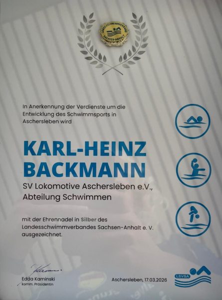 Vor seinem Einstieg als Trainer in den Schwimmsport 1975 war Karl-Heinz Backmann zunächst beim Handball aktiv. Dann hat er aber auch beim Sport an die Seite seiner Frau gewechselt und sich dem Schwimmen verschrieben. Zu DDR-Zeiten 15 Jahre lang als Trainer im TZ Dynamo in Aschersleben, danach im unzertrennlichen Team mit Sonja im Bereich des Breitensports. Von 1992 bis 2025 trug er die Verantwortung für 4 Trainingsgruppen und leitete zuverlässig wie ein Uhrwerk 2x pro Woche für jeweils 2h am Beckenrand sein Schwimmtraining für die Kinder und Jugendlichen. Neben seiner Trainertätigkeit in der Abteilung Schwimmen hat er seit 1992 als Vorstandsmitglied des SV Lok auch Verantwortung für den gesamten Verein übernommen. Von 1997 bis 2014 war er als stellvertretender Vorsitzender des Vereins tätig (ca. 1000 Mitglieder, in 13 Sportarten). Mit seiner Unterstützung fand unter anderem der Bau des neuen Vereinsheims mit Sanitärtrakt, Umkleide-, Aufenthalts- und Büroräumen statt und die Umgestaltung der Sportanlage des Vereins von zwei kleinen Rasenplätzen hin zu einem modernen Kunstrasenplatz mit Tartanlaufbahn. Da fällt natürlich auch viel Papierkram an. Lange Zeit war er dafür neben seiner sichtbaren Trainertätigkeit beim Schwimmen täglich von Mo bis Fr „unsichtbar“ im Sportbüro des Vereins engagiert. Eine Arbeit, die von der Allgemeinheit oft ungesehen bleibt oder völlig unterschätzt wird.
