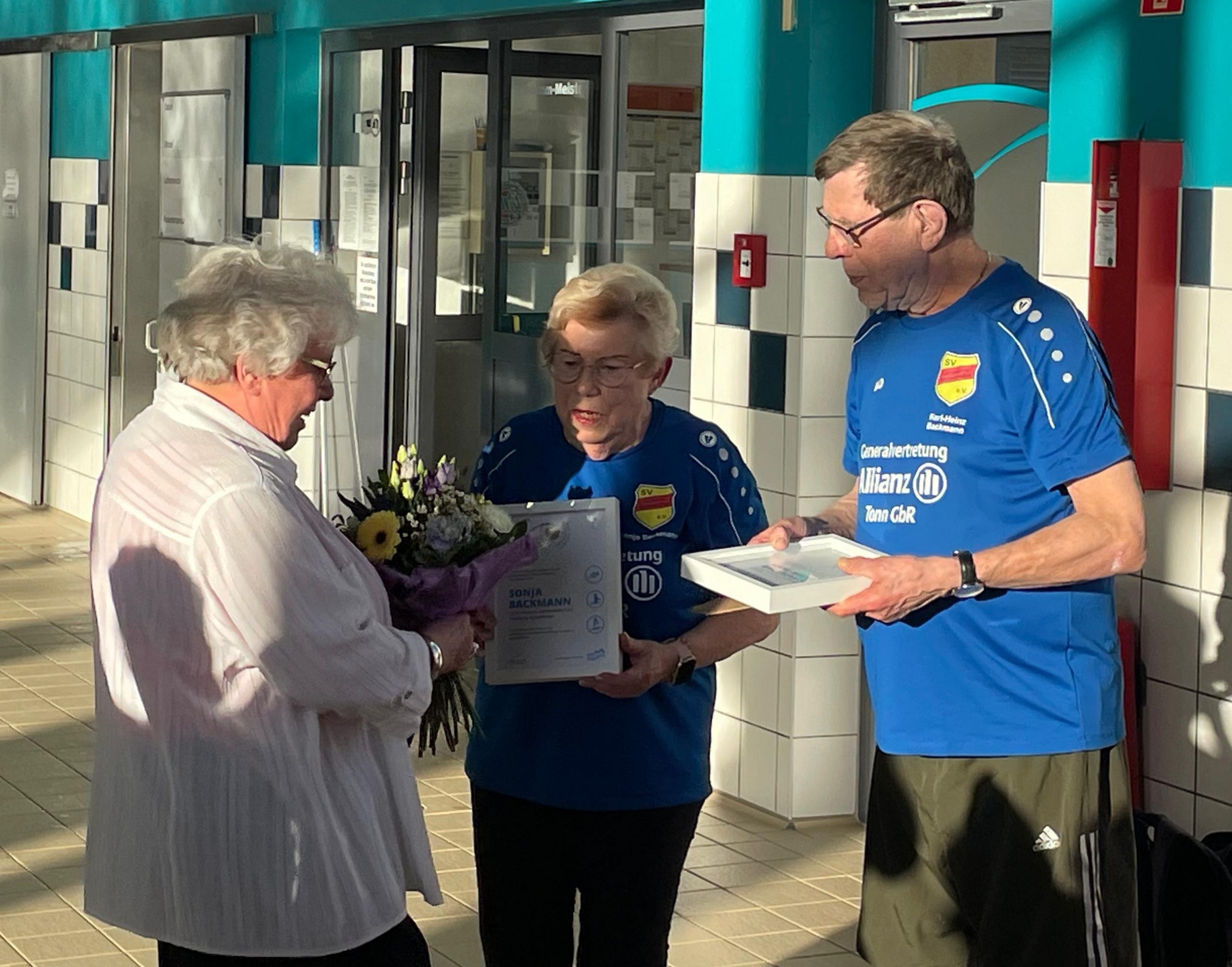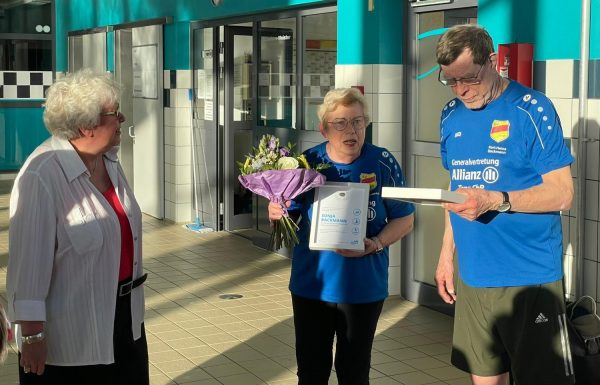 Die Präsidentin des Landesschwimmverbandes Sachsen-Anhalt, Frau Edda Kaminski, ist für die Auszeichnung persönlich nach Aschersleben gekommen. Neben den gerahmten Auszeichnungen und einem Blumenstrauß hatte sie auch viele lobende Worte für die beiden mitgebracht. Sonja und Kalle haben in über 5 Jahrzehnten nicht nur zwei Genrationen das Schwimmen beigebracht sondern haben den Schwimmsport in Aschersleben maßgebend geprägt und auch über schwierige Zeiten hinweg stets aufrecht erhalten.