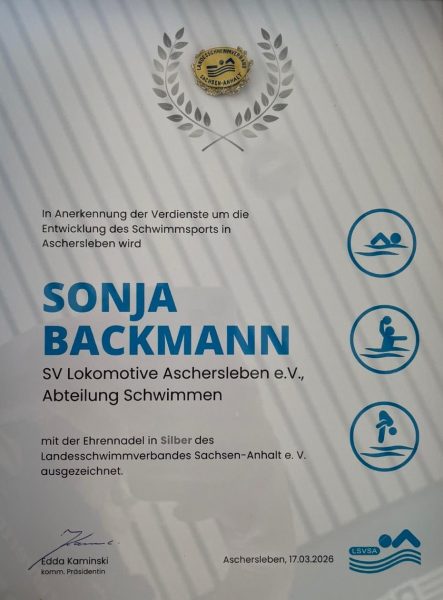 Vor seinem Einstieg als Trainer in den Schwimmsport 1975 war Karl-Heinz Backmann zunächst beim Handball aktiv. Dann hat er aber auch beim Sport an die Seite seiner Frau gewechselt und sich dem Schwimmen verschrieben. Zu DDR-Zeiten 15 Jahre lang als Trainer im TZ Dynamo in Aschersleben, danach im unzertrennlichen Team mit Sonja im Bereich des Breitensports. Von 1992 bis 2025 trug er die Verantwortung für 4 Trainingsgruppen und leitete zuverlässig wie ein Uhrwerk 2x pro Woche für jeweils 2h am Beckenrand sein Schwimmtraining für die Kinder und Jugendlichen. Neben seiner Trainertätigkeit in der Abteilung Schwimmen hat er seit 1992 als Vorstandsmitglied des SV Lok auch Verantwortung für den gesamten Verein übernommen. Von 1997 bis 2014 war er als stellvertretender Vorsitzender des Vereins tätig (ca. 1000 Mitglieder, in 13 Sportarten). Mit seiner Unterstützung fand unter anderem der Bau des neuen Vereinsheims mit Sanitärtrakt, Umkleide-, Aufenthalts- und Büroräumen statt und die Umgestaltung der Sportanlage des Vereins von zwei kleinen Rasenplätzen hin zu einem modernen Kunstrasenplatz mit Tartanlaufbahn. Da fällt natürlich auch viel Papierkram an. Lange Zeit war er dafür neben seiner sichtbaren Trainertätigkeit beim Schwimmen täglich von Mo bis Fr „unsichtbar“ im Sportbüro des Vereins engagiert. Eine Arbeit, die von der Allgemeinheit oft ungesehen bleibt oder völlig unterschätzt wird.